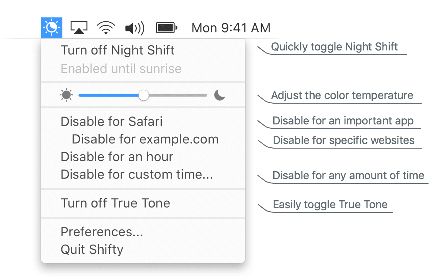 Shifty - Macinizde karanlık ve aydınlık mod arasında kolayca geçiş yapın. Sisteminiz Karanlık Modda çalışırken hangi Uygulamalarınızın veya web sitelerinizin açık kalması gerektiğine de karar verebilirsiniz. Ayrıca bakınız, NightOwl.