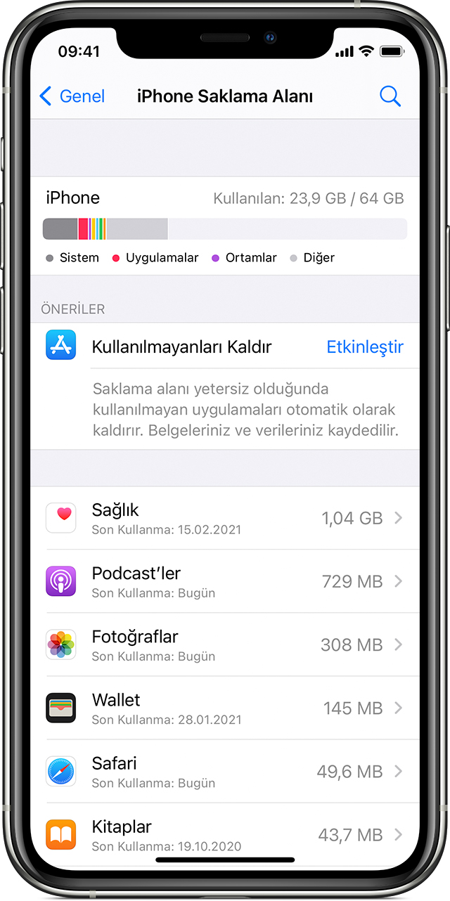 iPhone da Ayarlar > [Adınız] > iCloud > Depolamayı Yönet e gidin.