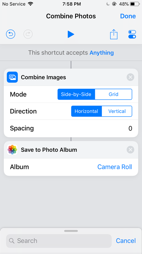 Kısayollar da, seçilen görüntüleri işleyen, birleştiren ve tekrar Fotoğraflar a kaydeden özel bir kısayol oluşturmanız gerekir.