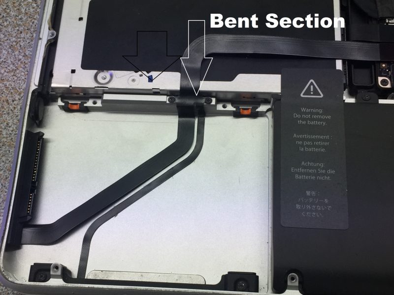 Esnek HDD kablosu MacBook a takıldığında, aşağıda gösterilen süper sürücünün kenarında iki kez 90 derece bükülür. Esnek plastiğin içindeki bakır tel, zamanla bükülen kısımda kırılma eğilimindedir. Arızalı kısım çıplak gözle görülemez. Bir multimetre (süreklilik testi) ile tespit edilebilir veya bükülmüş kısımda bir mikroskopla incelenebilir. Şüpheniz varsa, iyi bir HDD kablosuyla değiştirin.
