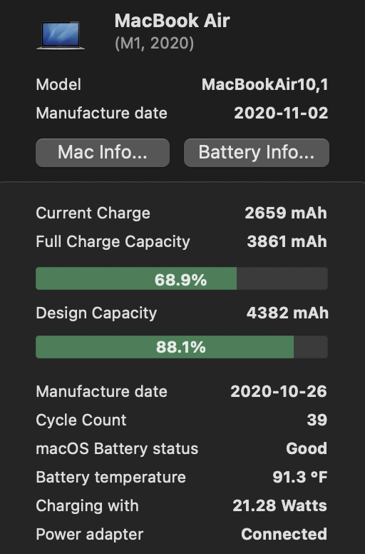 Döngü sayısı, pilinizin değiştirilmesi gerekmeden önce ne kadar süre kaldığı konusunda size iyi bir fikir vermelidir. Farklı MacBook ların döngü sayıları için farklı derecelendirmeleri vardır, bu nedenle, sonucunuzu Apple ın pil döngüsü destek sayfasındaki derecelendirmelerle çapraz referanslandırmanız gerekir. Hemen hemen her modern MacBook, MacBook Pro ve MacBook Air, 1.000 pil döngüsü için derecelendirilmiştir.
