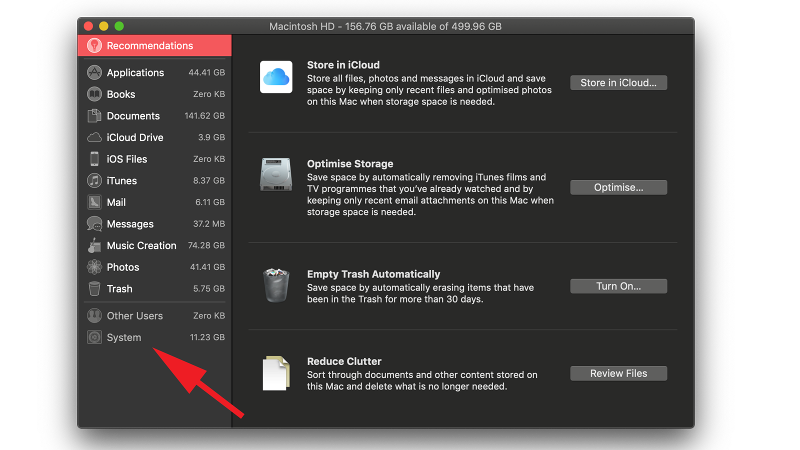 Bu Mac Hakkında da Depolama görünümünü açtığınızda, Sistem in fazla miktarda depolama alanı kapladığı sonucuna varmadan önce birkaç dakika beklemeye değer. Görünüşe göre, Sistem e atfedilen bazı şeyler iCloud a veya başka bir yere taşındığında (maalesef bu bizim durumumuzda olmamasına rağmen) birkaç dakika sonra kendini yeniden ayarlayabilir.