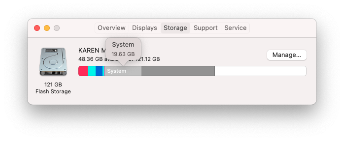 Diskinizdeki alanın nasıl tahsis edildiğini gösteren bir grafik göreceksiniz. Sistem gri renktedir ve fare imlecini alanın üzerine getirirseniz boyutu ortaya çıkarır. Daha ayrıntılı bir döküm için, kullandıkları depolama alanıyla birlikte listelenen çeşitli öğelerin yer aldığı yeni bir pencere açan Yönet… düğmesini tıklayın.